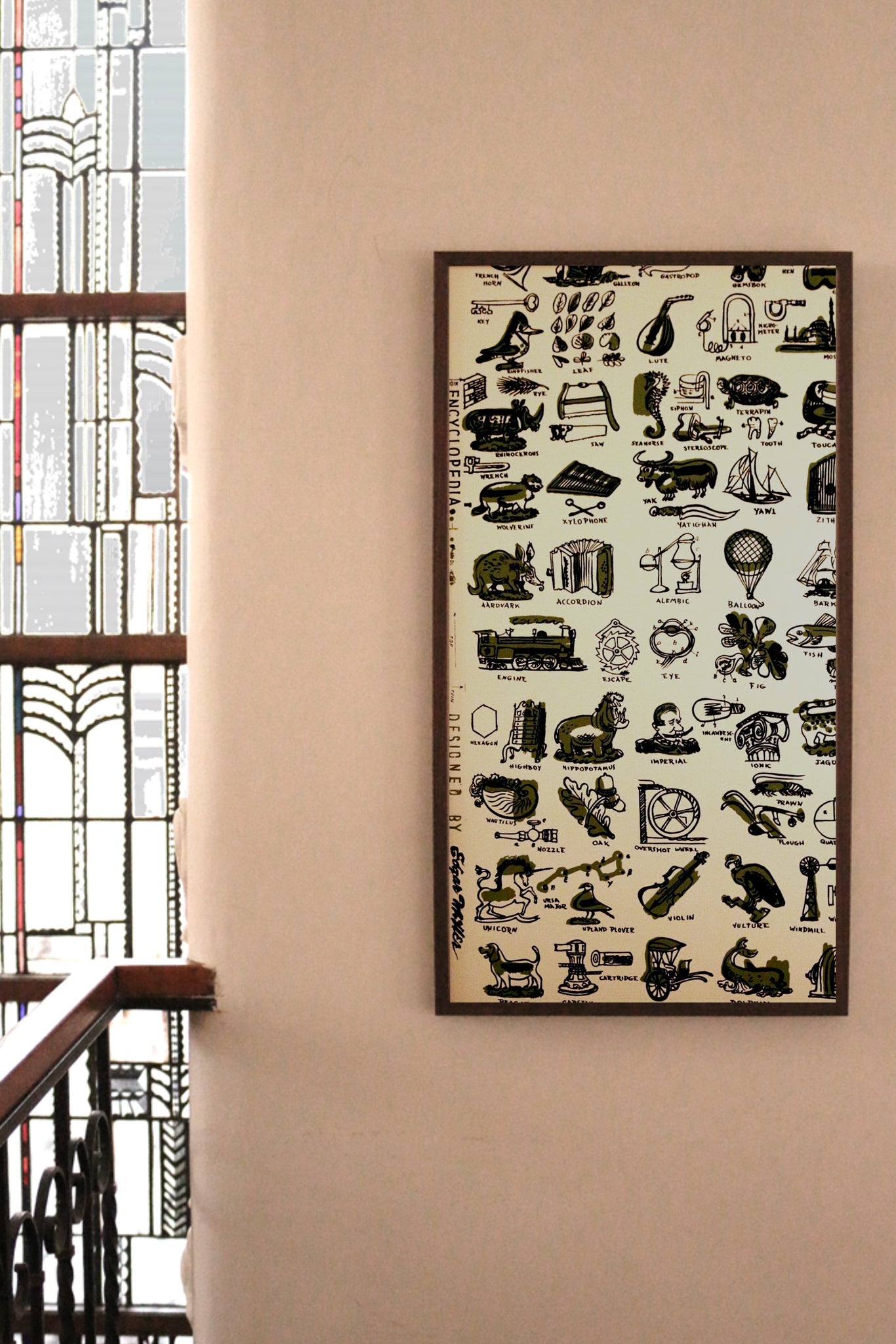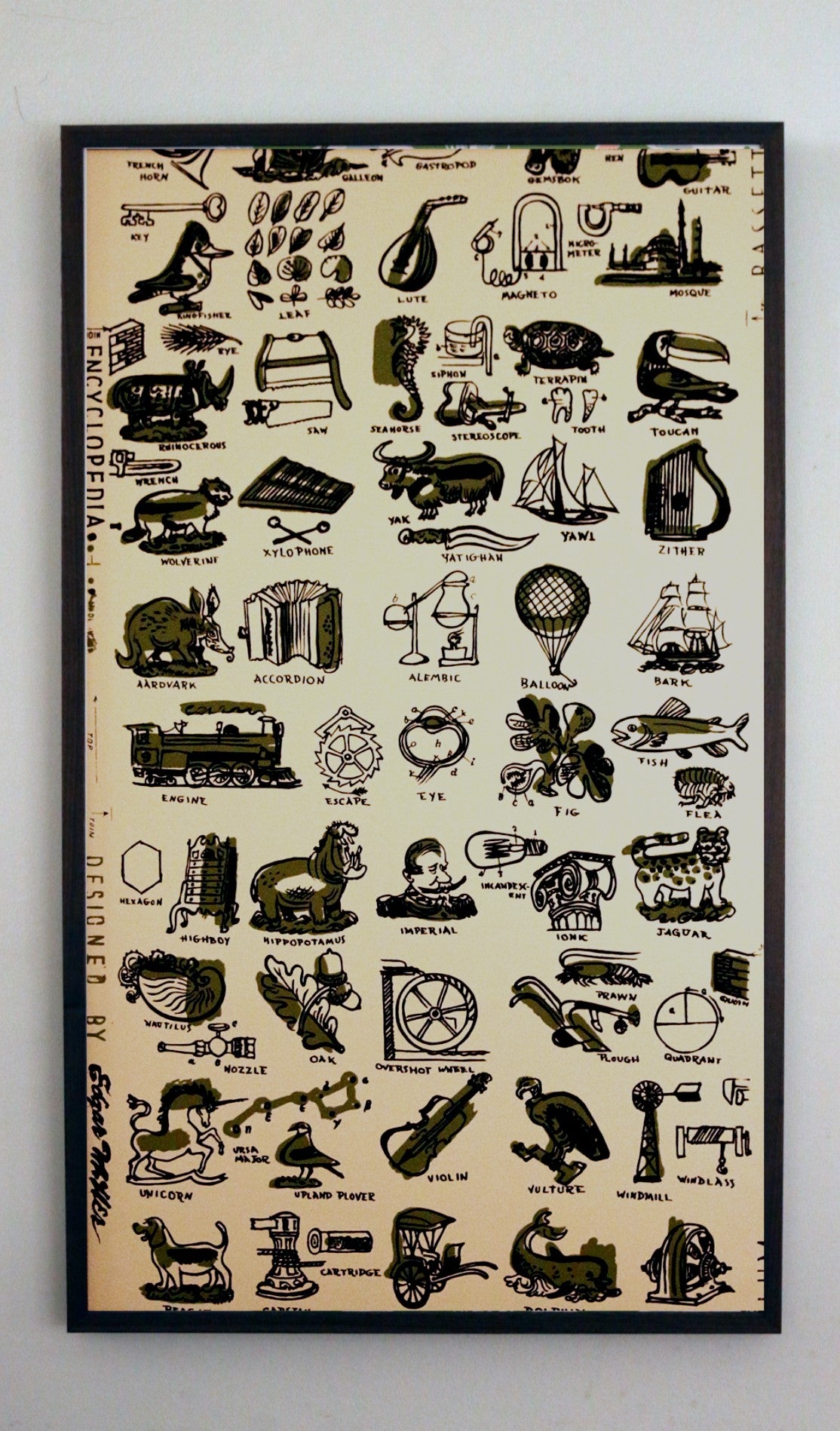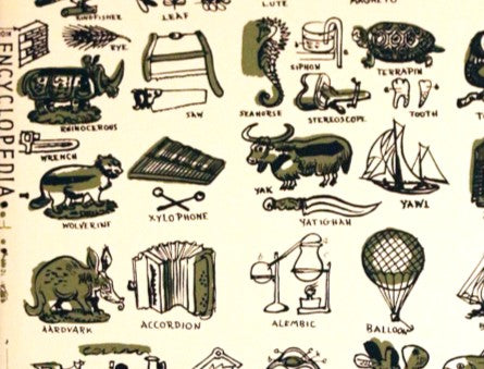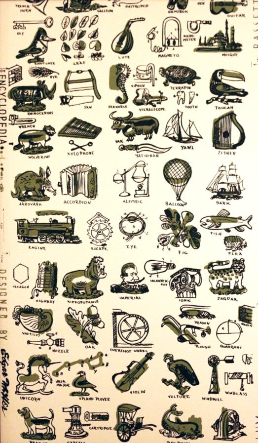 Encyclopedia by Bassett & Vollum is one of Edgar Miller’s most amusing and imaginative wallpaper designs. At once both scholarly and whimsical, the piece illustrates and identifies an eclectic sampling of Miller's favorite words and terms. Ever the avid learner himself, Miller filled this design with his childlike wonderment of the endless variety in the world.